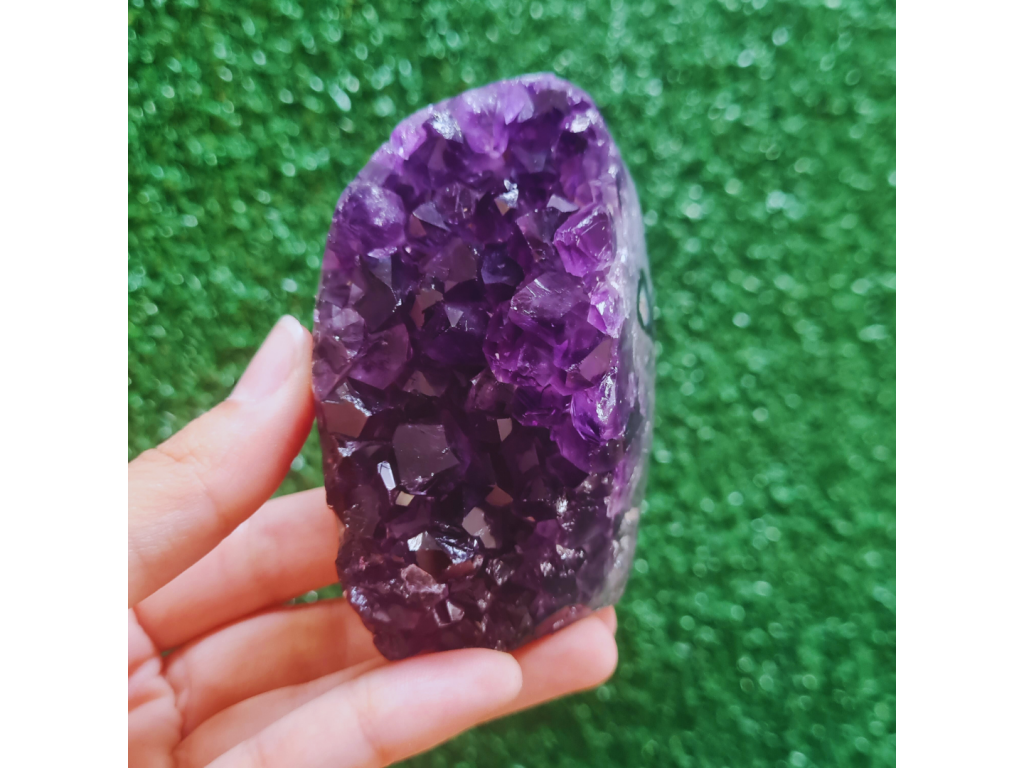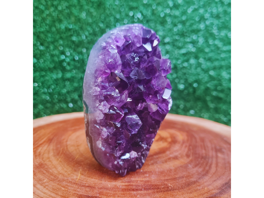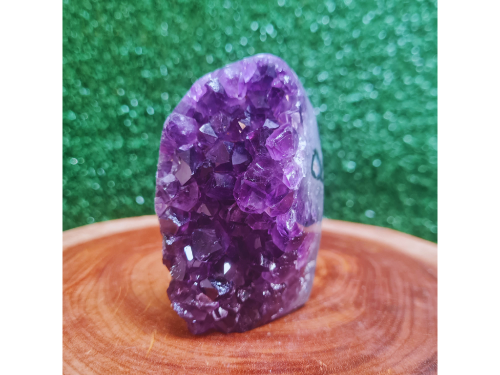 A Drusa de Ametista Polida combina a beleza natural e a intensa energia da Ametista em uma peça única. Em formato de drusa (múltiplos cristais conectados a uma base), ela potencializa a vibração do cristal, tornando-se um poderoso gerador de energia e um harmonizador de ambientes. Seu formato polido na base permite que se apoie de forma estável, enquanto a face dos cristais brutos mantém a energia pura e forte da natureza .