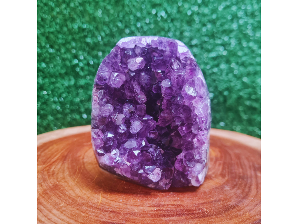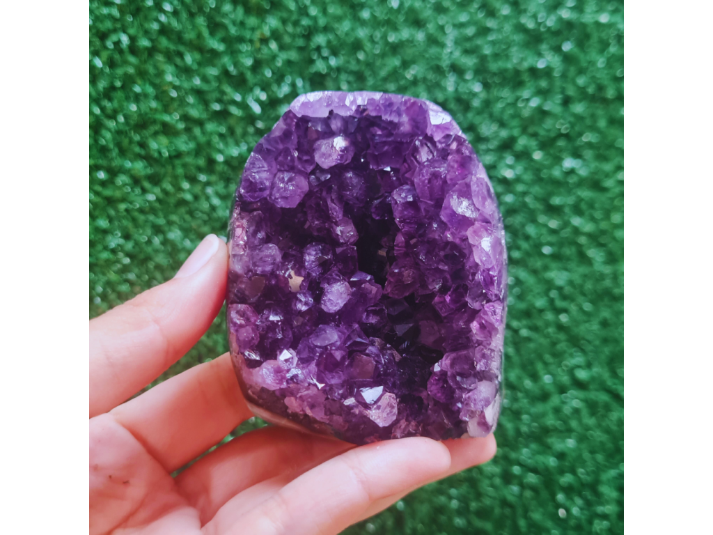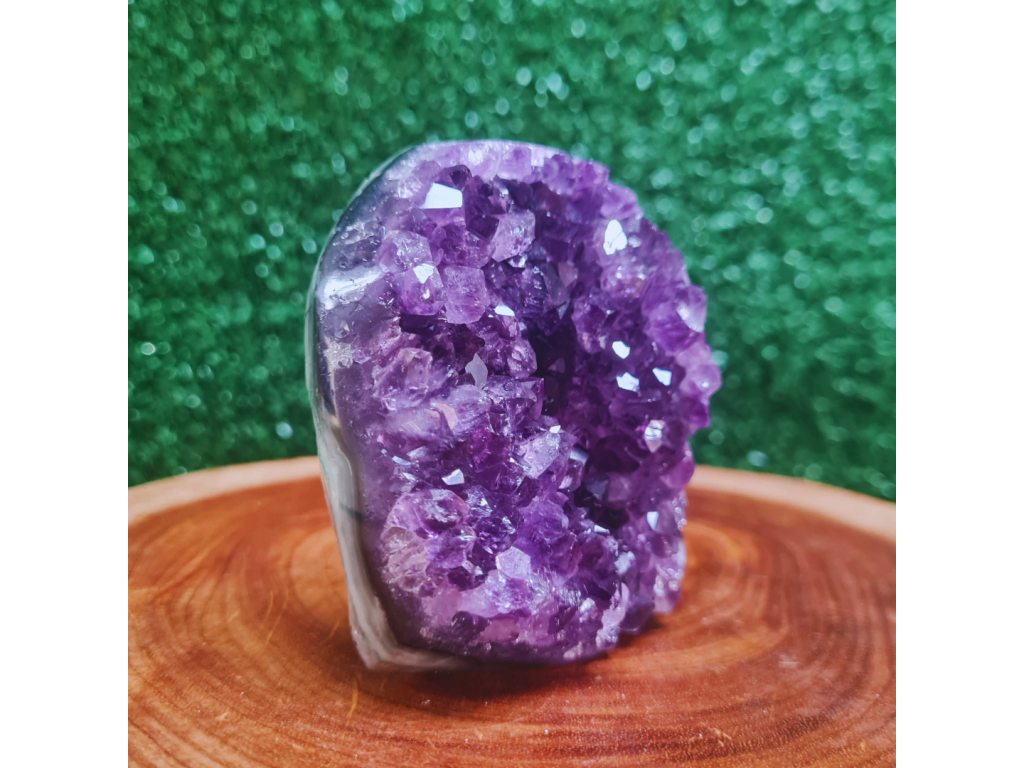 A Drusa de Ametista Polida combina a beleza natural e a intensa energia da Ametista em uma peça única. Em formato de drusa (múltiplos cristais conectados a uma base), ela potencializa a vibração do cristal, tornando-se um poderoso gerador de energia e um harmonizador de ambientes. Seu formato polido na base permite que se apoie de forma estável, enquanto a face dos cristais brutos mantém a energia pura e forte da natureza .
